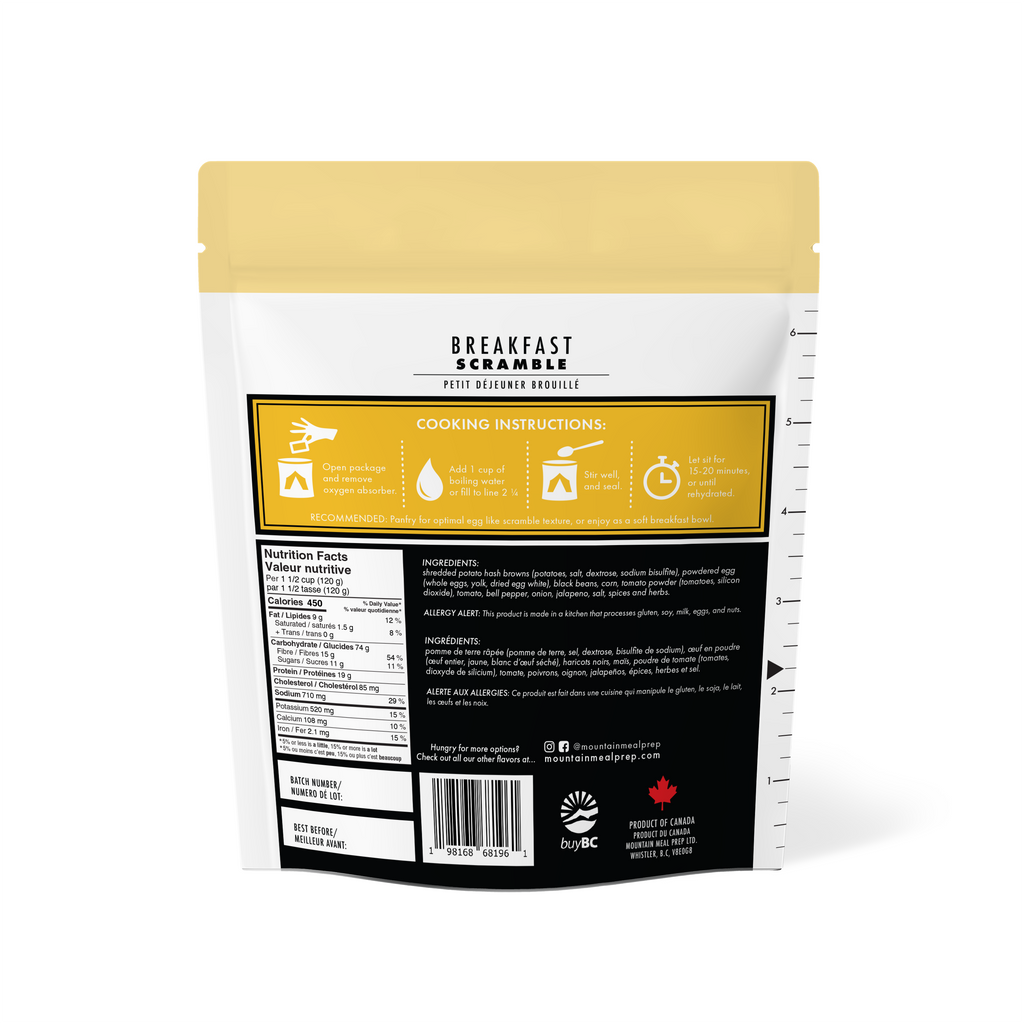 Ingredients: Shredded potato hash browns (potatoes, salt, dextrose, sodium bisulfite), powdered egg (whole eggs, yolk, dried egg white), black beans, corn, tomato, powdered cheese, bell pepper, onion, jalapeno, salt, spices, and herbs.